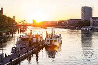 Excursieboten aan een steiger op de rivier de Weser voor de Stephanibrücke en de Wesertoren van Helmut Jahn in de Hanzestad Bremen.