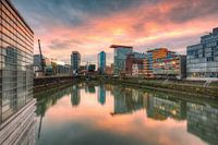 Uitzicht vanaf de havenbrug in de Mediahaven van Düsseldorf tijdens een kleurrijke zonsondergang. Links op de foto de glazen gevel van het gastronomisch restaurant "Lido", rechts het Innside Hotel en het Roggendorf-Haus met de kleurrijke mannetjes, ook wel Flossis genoemd.