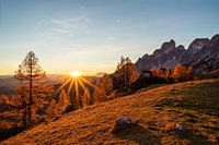 Op een mooie herfstdag zakt de zon achter de bergen en schijnt nog een korte tijd met haar laatste lichtstralen door de geel-oranje gekleurde lariksen en doopt de almweide in een warme gloed.