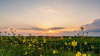 Op de voorgrond bloeit Raapzaad (Brassica rapa subsp. oleifera) in de berm en op de achtergrond een uitgestrekte polder waar de ondergaande zon achter de wolken verdwijnt en de lucht in gele en oranje tinten kleurt.