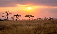 Een zonsondergang op de Serengeti in Tanzania.