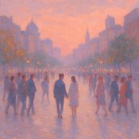 “Zonsondergang in de Stad – Een Moment van Stilte” is een warm en betoverend impressionistisch schilderij dat de magie van het alledaagse stadsleven vangt. Het kunstwerk toont een brede laan in het zachte licht van de ondergaande zon. De lucht is getint met roze en oranje pastelkleuren, die subtiel overvloeien in de koele blauwtinten van de gebouwen. Midden in de compositie loopt een koppel hand in hand, omringd door mensen die in alle rust door de avondwandelen — een harmonie van beweging en stilte.