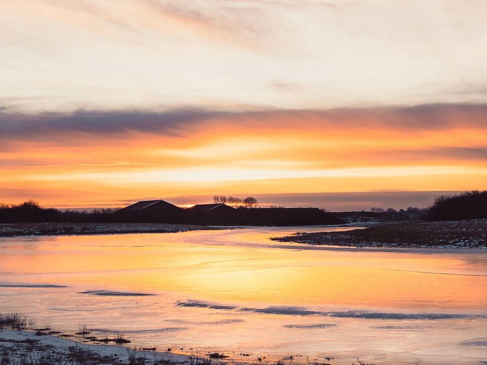 Foto van een winterlandschap in Zeeland. Zonsondergang in de polders van Nederland. Landschap in winter. Besneeuwde weide in Nederlands. Reisfotografie. Landschapsfotografie.