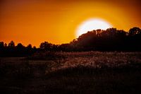 Prachtige foto van de ondergaande zon in Zuid-Limburg, Nederland. De pluisjes waardoor de planten hun zaden verspreiden, weerkaatsten het zonlicht en zorgen voor een uniek effect.