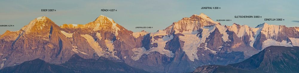 Dit panorama is opgebouwd uit circa 50 foto's en is geschikt voor afdrukken op groot formaat. Daarnaast heb ik op verzoek van een klant, alle namen en hoogtemeters van de bergen toegevoegd.