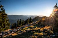 Warm licht van de avondzon bij Grubereck bij Kreuth. Schilderachtig berglandschap met bomen, bossen en bergen