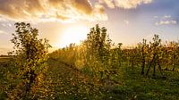 Deze sfeervolle landschapsfoto toont een zonsondergang in de boomgaarden van Hofheim a. Ts.