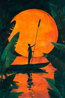 Op een magisch moment, als de dag plaatsmaakt voor de nacht, rijst het silhouet van een peddelaar op in een kalm waterlichaam. De enorme, oranjekleurige maan, omlijst door mysterieuze bladeren, baadt de scène in een warm licht, terwijl zachte golven de boot zachtjes wiegen en de stilte van de schemering vastleggen.