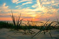 Uitzicht vanaf de duinen op het zandstrand van de Noordzeekust in Noord Holland tijdens een mooie zomerse zonsondergang na een warme dag in augustus.