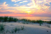 Uitzicht vanaf de duinen op het zandstrand van de Noordzeekust in Noord Holland tijdens een mooie zomerse zonsondergang na een warme dag in augustus.