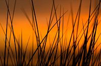 Zonsondergang gefotografeerd door grashalmen in de Zeeuwse duinen. Als je goed kijkt, kun je nog een beetje zien hoe de oranje lucht reflecteert via de zee.