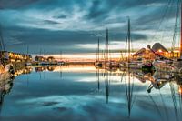 Het allerlaatste zonlicht in de haven van Stavoren op een windstille avond in het voorjaar als er nog weinig schepen afgemeerd liggen