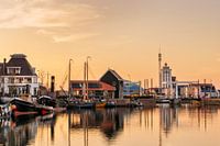 Zonsondergang in de Nederlandse historische haven van Harderwijk waar verschillende oude vissersschepen liggen