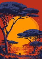 Dit indrukwekkende kunstwerk toont een spectaculaire zonsondergang boven een Afrikaanse savanne. De lucht is helder oranje en rood, terwijl de boomtoppen diepblauw zijn. Twee figuren lopen in de verte, wat een sfeer van avontuur en ontdekking creëert. Ideaal voor natuurliefhebbers en reisfans, dit motief geeft elke ruimte een warme,…