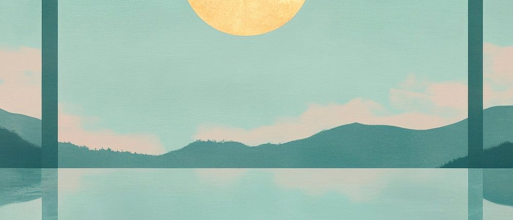 Een zacht lichtspel in warme gele en koele blauwgroene tinten creëert een harmonieuze sfeer. De eenvoudige, rechthoekige vorm lijkt een venster op de natuur en wordt weerspiegeld op het gladde wateroppervlak. Perfect voor de woonkamer om rust en inspiratie in de kamer te brengen.