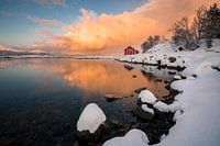 De zonsondergang kleurt de hemel boven een prachtig winters landschap. Een typisch rood Noors hutje steekt scherp af tussen de witte sneeuw.