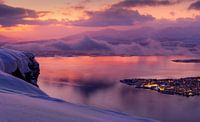 Tromsø is de grootste stad in noord Noorwegen. De stad ligt voor het grootste deel op het gelijknamige eiland. Deze foto is gemaakt in de winter, vanaf het uitzichtpunt op de berg aan de top van de kabelbaan.