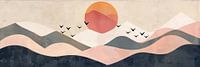 Deze minimalistische kunst vangt de zonsondergang in een surrealistische wereld waar woestijnen en bergen harmonieus in elkaar overgaan. De strakke lijnen en zachte kleuren creëren een rustgevende sfeer, terwijl de silhouetten van de vogels een poëtische toets toevoegen. Ideaal voor moderne woonruimtes die op zoek zijn naar een rustige en ontspannende decoratie.