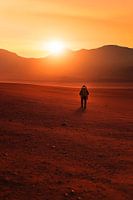 Een eenzame wandelaar doorkruist een uitgestrekt landschap van rood zand terwijl de zon met stralende kleuren ondergaat. De zachte golven van de bergen op de achtergrond geven het scenario een mystieke diepte. Dit beeld straalt rust en verlangen uit, perfect voor een woonkamer waar het je uitnodigt om te dromen en te ontspannen.