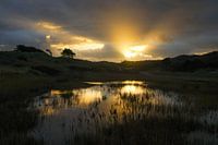 De zon zakt langzaam achter de horizon bij een mooi meertje in berkheide te Wassenaar