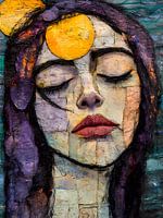 Abstract mixed media vrouwenportret met zonsondergang in haar derde oog.