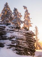 Zonsondergang in het diep ondergesneeuwde Beierse Woud, Dreisessel, Beieren, Duitsland
