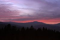 Zonsondergang in het Beierse Woud, Duitsland. Als de zon bijna verdwenen is kleurt de lucht met roze, lila en paarse tinten. Op de voorgrond de toppen van naaldbomen, daarachter heuveltoppen van het Bayerischer Wald.