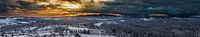 Zonsondergang over het besneeuwde winterlandschap bij Neuschönau, Beieren, Duitsland.