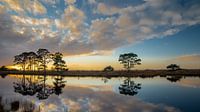Een prachtige zonsondergang boven het Nationaal Park Dwingelderveld in Drenthe. In het water is de reflectie te zien van de bomen die naast de waterkant staan. De lucht er boven is prachtig verlicht.