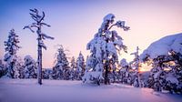 Zonsondergang in besneeuwd bos , Luosto, Fins Lapland
