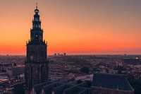 Zonsondergang in het centrum van Groningen met de Martinitoren en Martinikerk centraal in beeld. Foto genomen vanaf het dak van het nieuwe Forum gebouw.