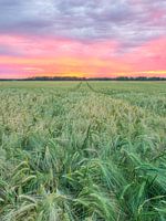 Uitzicht over een jong gerstveld tijdens een glorieuze zonsondergang in de vroege zomer.