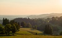 Het Erstgebergte op de grens van Tsjechië en Duitsland heeft uitgestrekte bossen met hier en daar een klein dorpje. Hier steekt de kerktoren van Krasna Lipa nog net boven de bomen tijdens een oranje zonsondergang.