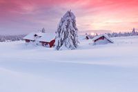 Prachtig avondrood en ongerepte sneeuw in een bergdorpje nabij Sjusjoen in de omgeving van Lillehammer, Norway