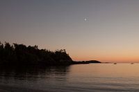 Rustgevende foto van de zonsondergang met kalm blauw water in de voorgrond, wat overloopt naar de oranje lucht en vervolgens weer donkere blauw van de avond. Met daarin de inmiddels opgekomen maan.