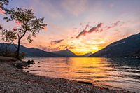 Prachtige kleurrijke zonsondergang bij het meer van Thun in Zwitserland. De oranje roze kleur van de lucht weerspiegelt in het meer.