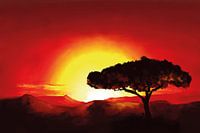 Digitaal acrylschilderij van een landschap met bergen en heuvels en een eenzame, typisch Afrikaanse burkea africana boom. De ondergaande zon kleurt het landschap rood en goud en zorgt voor een bijna surreële scene.