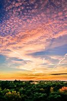 Zonsondergang met mooie lucht en bos op de voorgrond