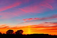 Zonsondergang met roze en paars verlichte wolken tegen een blauwe hemel op de achtergrond aan het einde van een mooie herfstdag. Als de zon op deze herfstavond begint onder te gaan, wordt de hemel beschilderd met een adembenemende reeks roze en oranje wolken. De ooit blauwe lucht verandert in een canvas van warme kleuren, als de zonnestralen op de wolken weerkaatsen en ze verlichten in roze en oranje tinten. De wolken lijken zacht en donzig, als suikerspin, als ze zich uitstrekken over de horizon. Hun randen zijn omzoomd met een zachte gouden tint, die hen een zachte, uitnodigende gloed geeft.