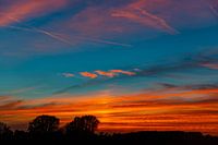 Zonsondergang met roze en paars verlichte wolken tegen een blauwe hemel op de achtergrond aan het einde van een mooie herfstdag. Als de zon op deze herfstavond begint onder te gaan, wordt de hemel beschilderd met een adembenemende reeks roze en oranje wolken. De ooit blauwe lucht verandert in een canvas van warme kleuren, als de zonnestralen op de wolken weerkaatsen en ze verlichten in roze en oranje tinten. De wolken lijken zacht en donzig, als suikerspin, als ze zich uitstrekken over de horizon. Hun randen zijn omzoomd met een zachte gouden tint, die hen een zachte, uitnodigende gloed geeft.