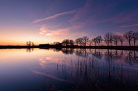 De bomen aan de rand en de strepen in de lucht reflecteren in het water, terwijl de ondergaande zon, de drie boompjes verder op nog een beetje verlicht. Het was windstil, en het water leek wel een spiegel. De lucht heeft prachtige kleuren. Een mooi sereen beeld. Ik hou van kalmte in mijn foto's, van rust, ik hoop dat ik dat hier ook heb kunnen weergeven. Met mijn statief en mijn laarzen aan in het water om de foto te kunnen maken. De foto is genomen op 7 maart 2022, in Drenthe, Nederland.