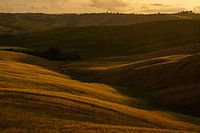 De warme gloed van de zonsondergang beschijnt de glooiende heuvels in de Val d'Orcia in de buurt van Pienza in Toscane, Italië, terwijl een regenbui losbarst. Prachtige schaduwen ontstaan op de hellingen van de heuvels.