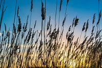 Koop de foto Zonsondergang met rietpalmen. van Hennnie Keeris op canvas, aluminium dibond, (ingelijste) fotoprint, behang en ArtFrame, op maat geprint in Fine-Art kwaliteit.