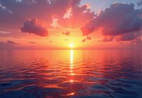 Een levendige zonsondergang boven een kalme oceaan. De lucht vertoont intense oranje en roze tinten, gereflecteerd op het wateroppervlak. Wolken zijn verspreid over de lucht en voegen diepte toe aan de scène.
