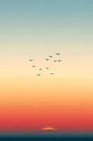 Dit prachtige ontwerp straalt rust en sereniteit uit, met een minimalistische weergave van een groep vogels die over een zonsondergang vliegt. De zachte kleuren van de lucht, variërend van diep oranje en rood tot zachte blauwtinten, creëren een kalmerend effect, ideaal voor interieurs die een gevoel van rust willen uitstralen. Het eenvoudige silhouet van de vogels tegen de uitgestrekte lucht voegt een gevoel van vrijheid en ruimte toe aan de afbeelding, wat het een uitstekende keuze maakt voor een werkplek of slaapkamer. Het ontwerp past goed binnen een modern interieur en biedt een tijdloze uitstraling door het minimalistische karakter.