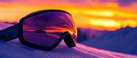 Een adembenemende zonsondergang wordt weerspiegeld in de glinsterende lenzen van een skibril, omringd door een besneeuwd landschap. De felle kleuren oranje en paars zorgen voor een warm, uitnodigend accent. Dit kunstwerk zal zijn perfecte plaats vinden in de woonkamer, waar het dromen van avontuur en vrijheid zal opwekken.