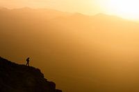 Een wandelaar loopt naar de rand van de klif in de buurt van Famara, Lanzarote. Het laatste zonlicht werpt een gele gloed over het gehele eiland.