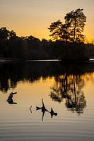 Zonsondergang Van Esschenven in de Oisterwijkse Bossen en Vennen. Eilandjes met bomen in de herfst. Prachtige weerspiegeling in een windstil water.