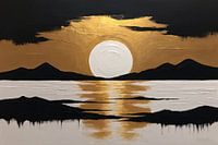 Laat deze betoverende afbeelding de serene kalmte van de natuur in uw ruimte brengen. Het kunstwerk toont een minimalistische maar majestueuze zonsondergang, badend in tinten van diep zwart, rijk goud en zuiver wit. Deze gestileerde weergave van een zonsondergang, gereflecteerd over een stil meer met een achtergrond van statige bergen, roept een gevoel van vredige contemplatie op. Het gouden uur is vastgelegd in een tijdloze omhelzing, perfect voor het verfraaien van moderne interieurs die verlangen naar een vleugje natuurlijke schoonheid en een moment van rust.