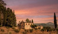 Grieks oud vervallen landhuis met mooie cipressen er om heen tijdens een zonsondergang